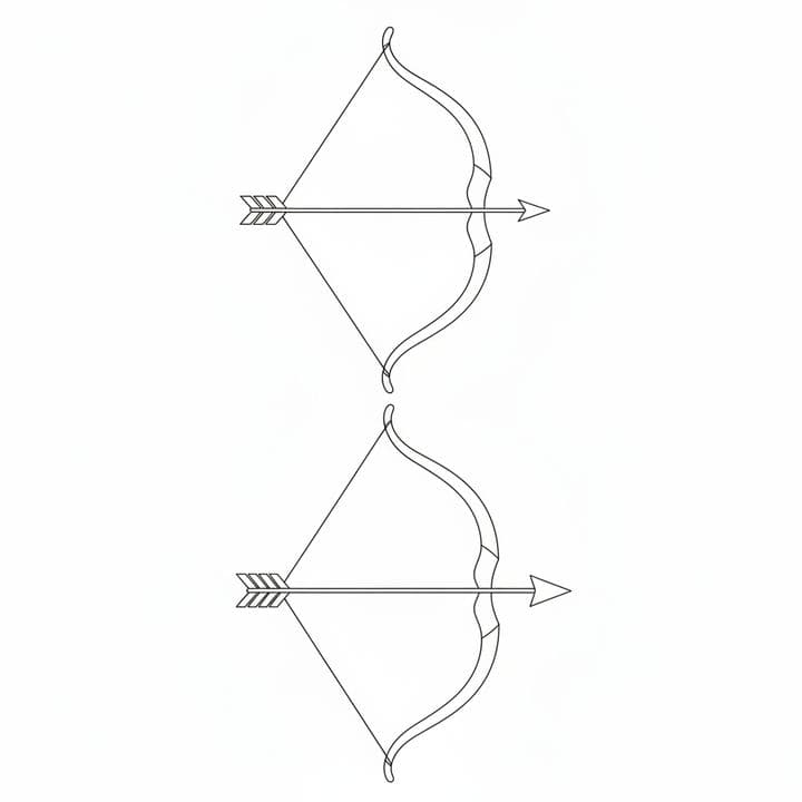 Two bows with arrows, poised for flight, stand side by side. Their minimalist design is simple, evocative of precision and intent. The bows are unadorned, their elegance lies in their pure form. Ready...Read more