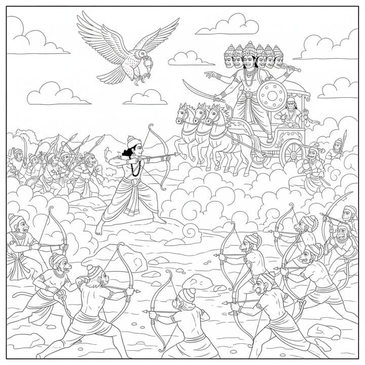 An intense battle unfolds. Rama stands firm, bow drawn, amidst a sea of archers. Above, Garuda soars. Before him, the formidable Ravana rides a chariot drawn by horses. The armies clash amid a clouded...Read more