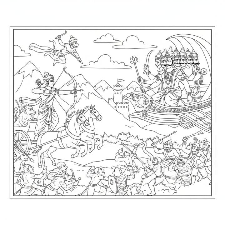 A detailed line art image captures an epic battle scene. An archer on a horse-drawn chariot aims at a multi-headed figure riding a stylized boat-like structure in the sky. Below, a fierce battle rages...Read more