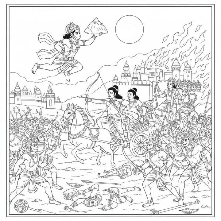 A dynamic black and white scene shows a fierce battle unfolding, potentially from Hindu mythology. Archers on a chariot lead the charge. Below, soldiers clash amidst fallen warriors. Hanuman flies abo...Read more