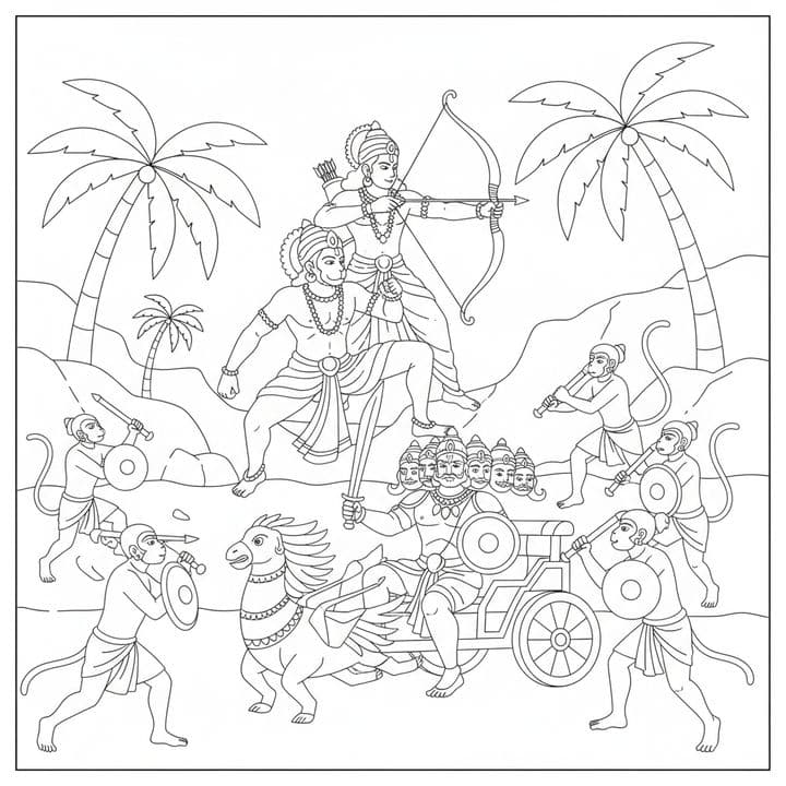 A detailed line art drawing depicts a scene of epic conflict. Lord Rama, with his bow drawn, stands beside Hanuman, facing Ravana on his chariot. Monkey warriors, armed and ready, flank the chariot, w...Read more