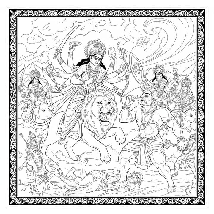 An intricate black and white drawing showcases the goddess Durga riding a lion into battle. Armed with multiple weapons, she confronts a demon while other deities stand behind her. The scene is filled...Read more