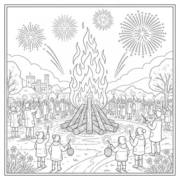 A community gathers around a large bonfire on a celebratory night. Fireworks light up the sky above them, and many hold sparklers. A distant castle stands silhouetted against the horizon. Children hol...Read more
