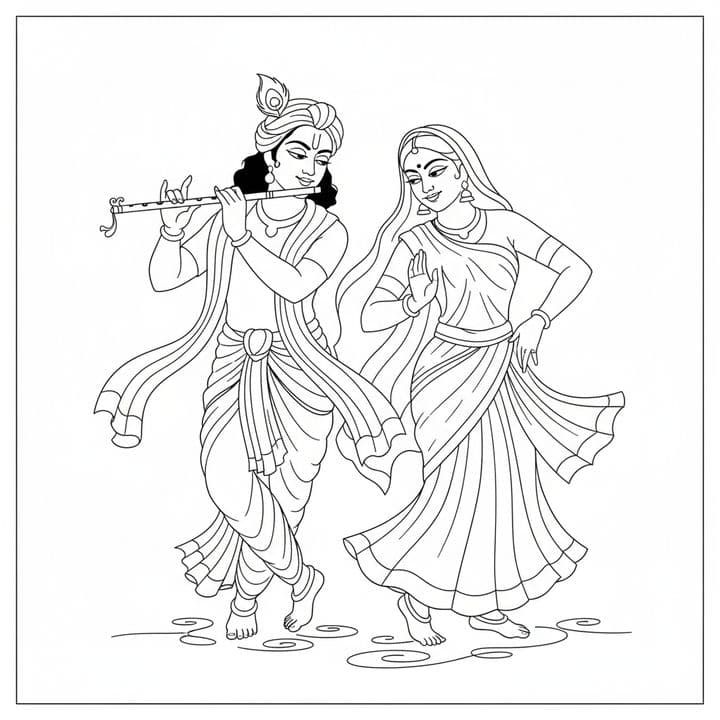 A black and white drawing showcases a divine couple gracefully dancing. One figure plays a flute, while the other elegantly gestures, both adorned in traditional attire. Their movements create subtle ...Read more
