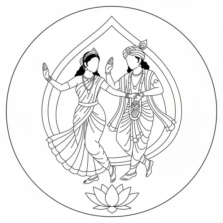 A monochromatic illustration shows a dancing couple within a droplet-shaped frame, enclosed in a circle. Dressed in traditional Indian attire, they appear to be in motion. A lotus flower is drawn at t...Read more