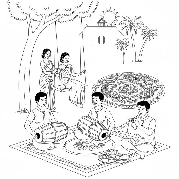 A black and white drawing depicts a celebration. Two women in saris enjoy a swing under a tree, while musicians play instruments. A feast is laid out on a decorated mat. Palm trees and a house are in ...Read more