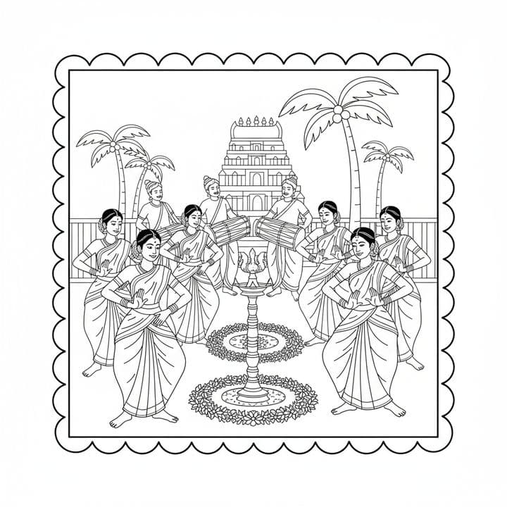 A line art scene depicts a traditional Indian dance performance. Women in saris perform graceful poses around a ceremonial lamp adorned with flowers. Musicians play drums behind them. A temple and pal...Read more