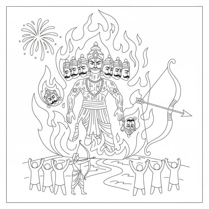 An illustration shows the burning of the effigy of Ravana with ten heads amidst flames. A figure stands with a bow and arrow aimed, while crowds cheer in the background. A firework is seen in the uppe...Read more