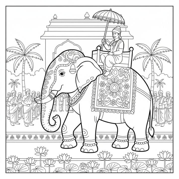A decorated elephant carries a rider under an umbrella near a temple and palm trees. People in traditional clothing stand on either side, and lotus flowers grow in the foreground, creating a serene an...Read more