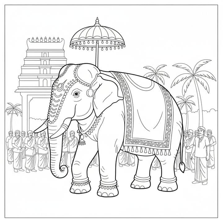 A decorated elephant stands regally, adorned with ornate coverings and jewelry. An umbrella shades it from the sun, while it's surrounded by onlookers and palm trees. In the background, a temple-like ...Read more