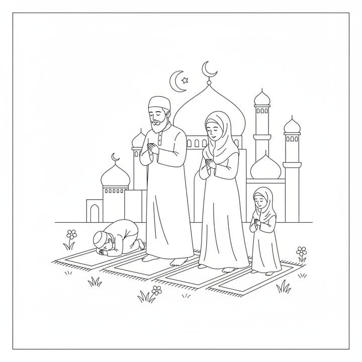 A black and white drawing features a Muslim family praying in front of a mosque. The father, mother, and young daughter stand reverently with hands together, while another child kneels in prayer. Pray...Read more