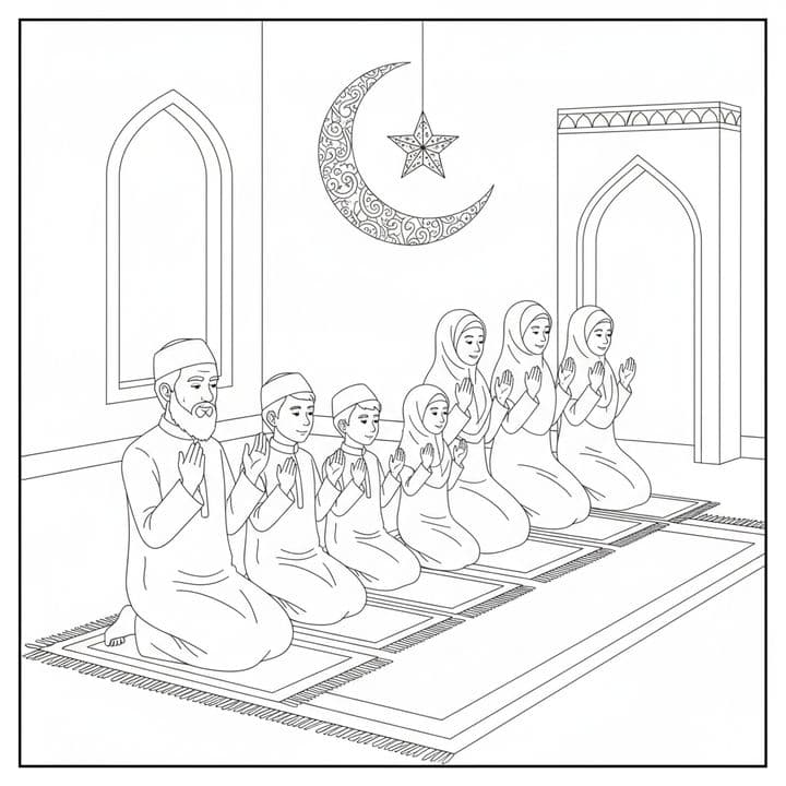 A serene illustration depicts a Muslim family at prayer. They kneel on individual rugs, hands raised in devotion. A crescent moon and star adorns the scene, evoking a sense of spiritual connection. Ar...Read more