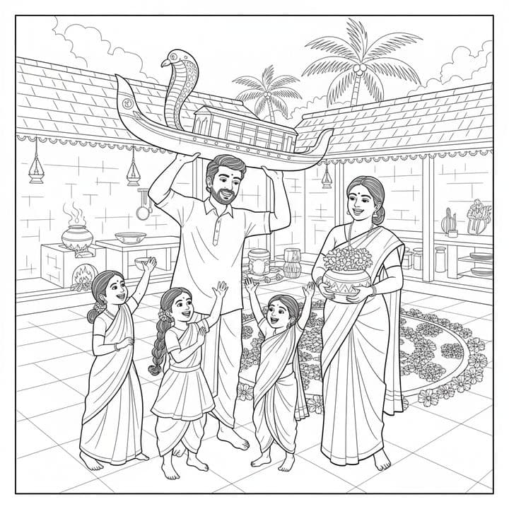 A heartwarming scene unfolds as a family joyfully celebrates Onam. The father proudly holds a traditional snake boat, while his wife carries a pot brimming with vibrant flowers. Their three daughters ...Read more