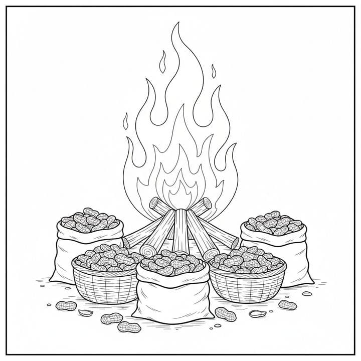 A cozy illustration depicts a crackling bonfire. Gathered around the fire are sacks and baskets brimming with peanuts. The scene suggests a warm, perhaps autumnal gathering where roasting peanuts is t...Read more