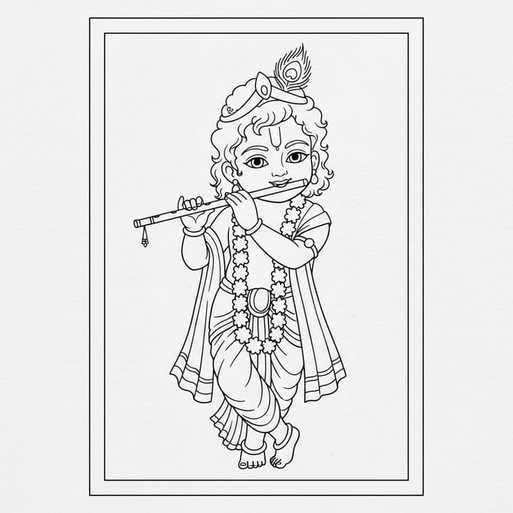 A delightful black and white drawing shows baby Krishna playing his flute. He wears a garland and a peacock feather sits atop his head. His curly hair frames his face as his fingers dance upon the flu...Read more