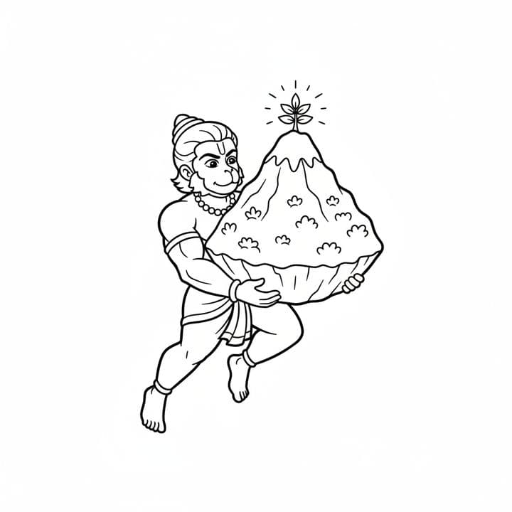 A line drawing shows Hanuman carrying a mountain. The mountain has a plant growing on its peak, radiating light. Hanuman is drawn with a strong physique. He wears a beaded necklace and armbands. His f...Read more