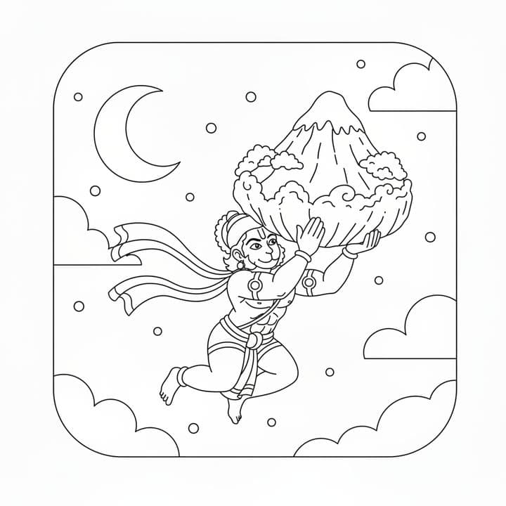 A cartoonish depiction shows Hanuman, a Hindu god, flying amidst clouds and stars. He's carrying a mountain overhead, looking determined. The scene includes a crescent moon, adding to the celestial se...Read more