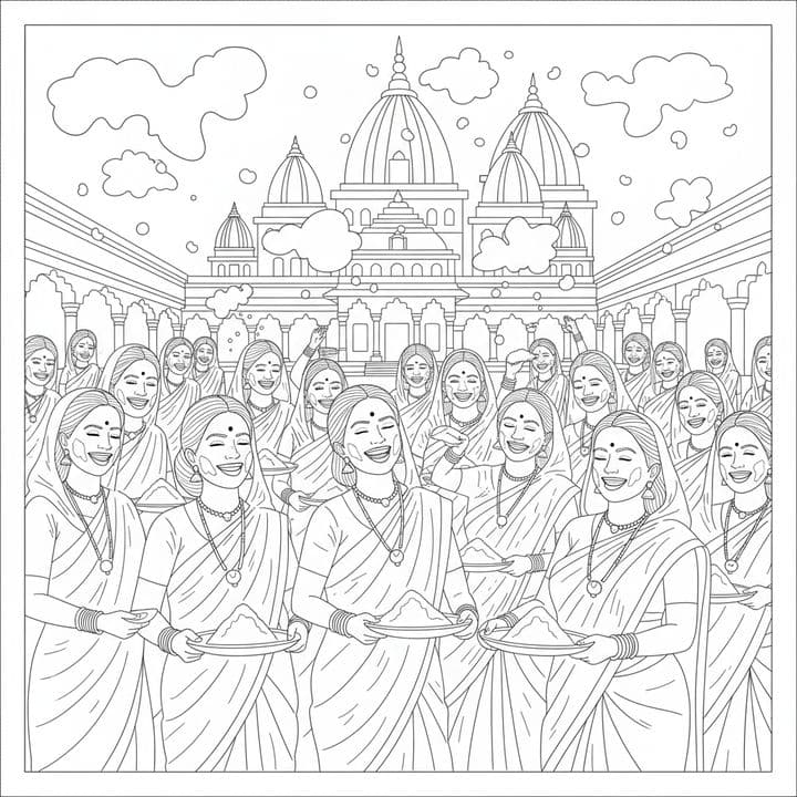 A line drawing captures the spirited celebration of Holi. Smiling women in traditional saris hold plates of color, their faces dusted with festive hues. An ornate temple stands grandly in the backgrou...Read more