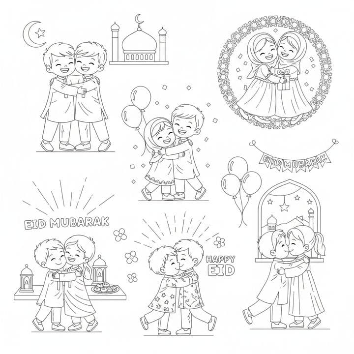 A cheerful black and white illustration captures the joy of Eid. Children are shown in various scenes, embracing each other in warm hugs. Mosques, crescent moons, balloons, and banners reading "Eid Mu...Read more