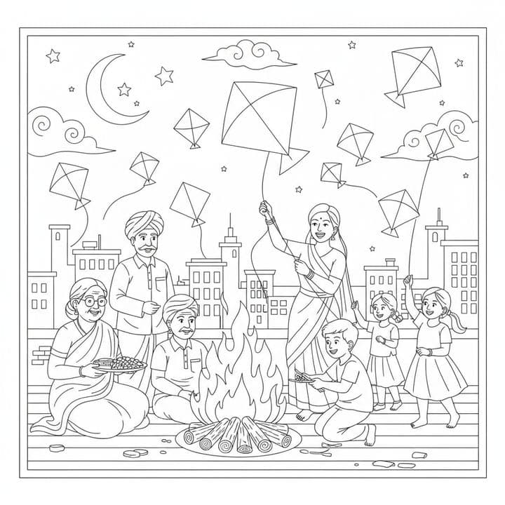 A family gathers on a rooftop, celebrating a festival. A bonfire blazes, casting a warm glow, while colorful kites dance in the sky. Adults supervise, smiling, as children eagerly fly their own kites....Read more