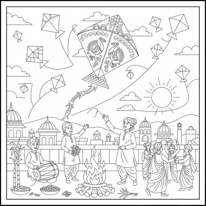 A lively illustration captures the spirit of Lohri, a North Indian festival. Children and adults dressed in traditional attire celebrate around a bonfire. A drummer plays music, while kites soar high,...Read more
