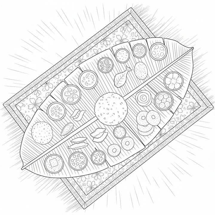 An overhead line drawing showcases a traditional meal served on a banana leaf, set atop a floral tablecloth. Various small bowls and dishes filled with different foods surround a mound of rice at the ...Read more