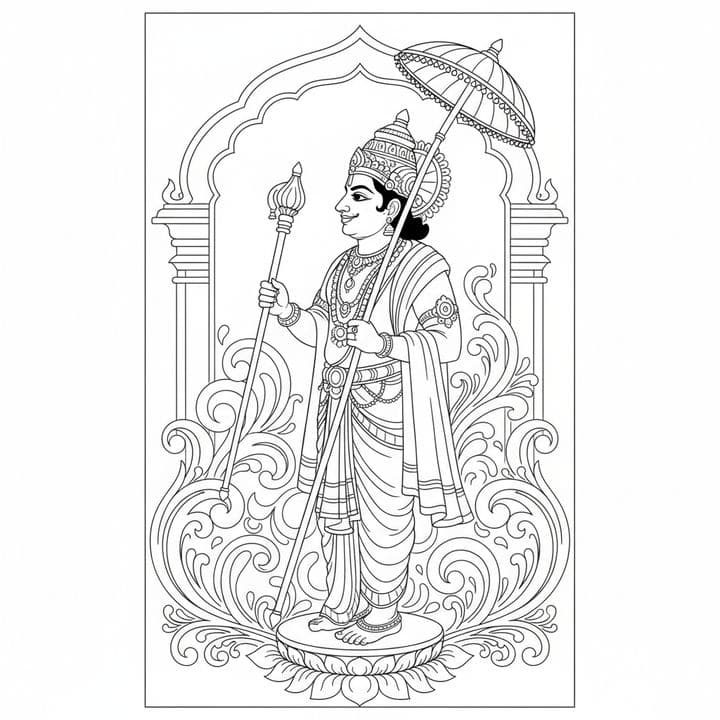 An intricate black and white line drawing presents a regal figure under an umbrella, possibly a deity or royalty. The subject stands poised atop a lotus pedestal, framed by elaborate floral scrolls an...Read more