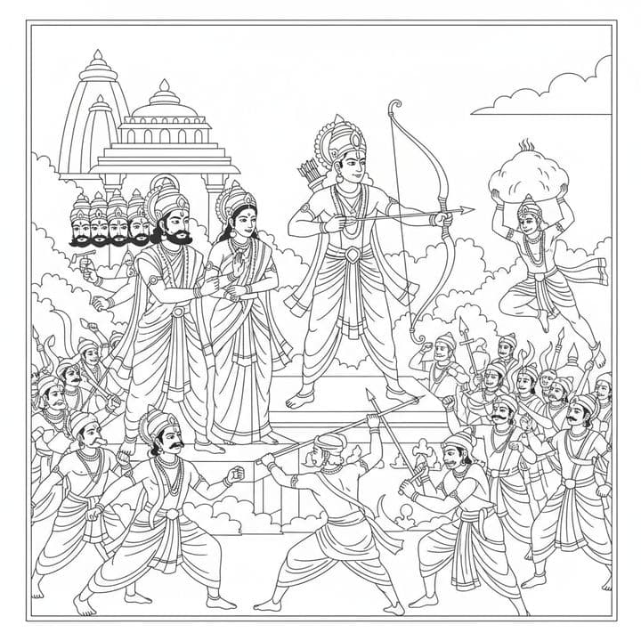 A detailed monochrome illustration depicts a scene from the Ramayana. Rama stands tall, bow drawn, alongside Sita. Hanuman carries a mountain nearby. Ravana, with his many heads, lurks in the backgrou...Read more
