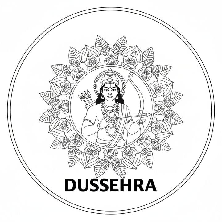 An illustration shows Rama holding a bow and arrow, ready to shoot. Behind him, a quiver of arrows is visible. Rama is framed by a beautiful floral mandala, comprised of delicate leaves and blossoms. ...Read more