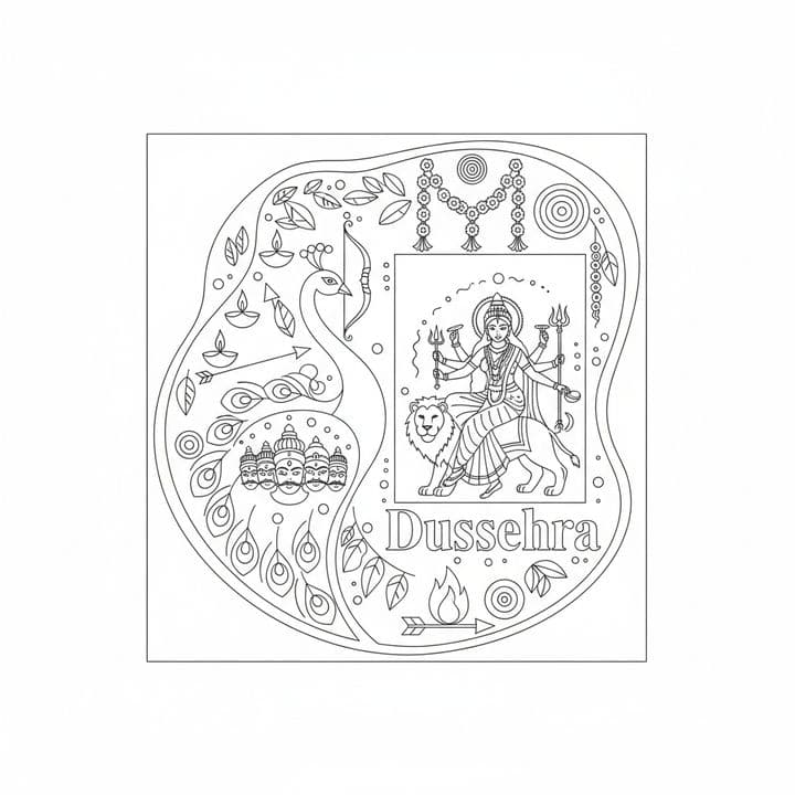 This monochrome line drawing celebrates the Dussehra festival. Goddess Durga, riding a lion, occupies a central frame. Surrounding her are symbolic elements like a peacock with a bow, diyas, the ten h...Read more