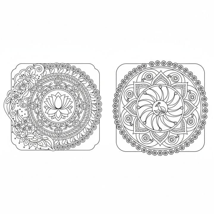 Two detailed mandala designs are presented. One features a prominent lotus flower at its center, surrounded by floral elements. The second mandala displays a stylized bird, possibly a peacock, at its ...Read more