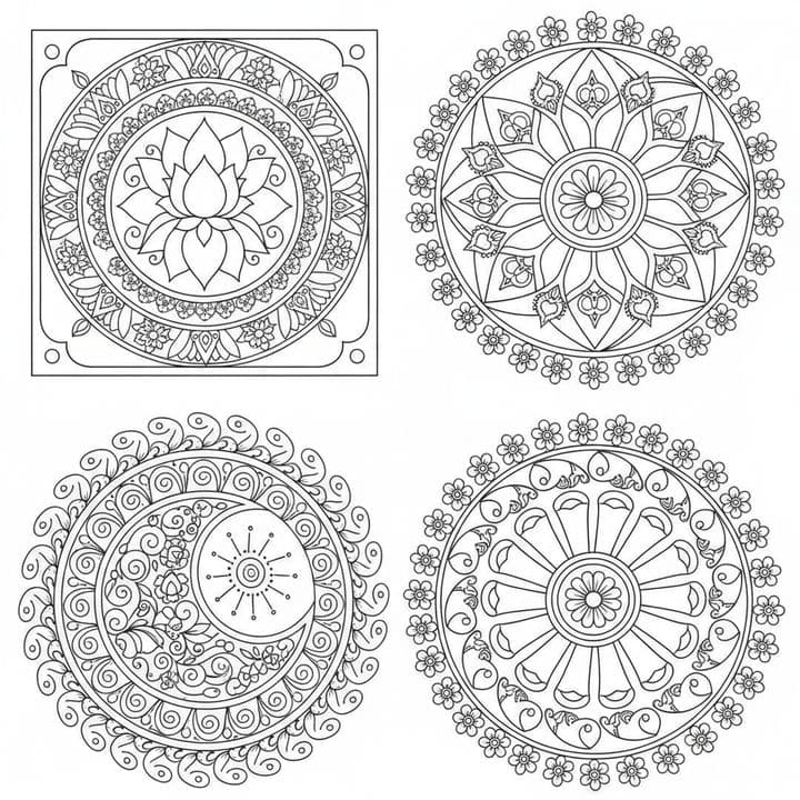 The image showcases four intricate floral designs in a black and white palette, potentially representing mandalas. One is square-shaped, featuring a central lotus, while the remaining three are circul...Read more