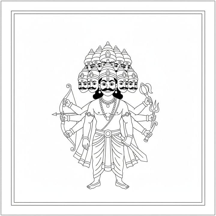 The intricate black and white line art showcases a multi-headed, multi-armed figure. The figure has ten heads, each with a mustache, and numerous arms holding weapons like a bow and arrow. Wearing orn...Read more