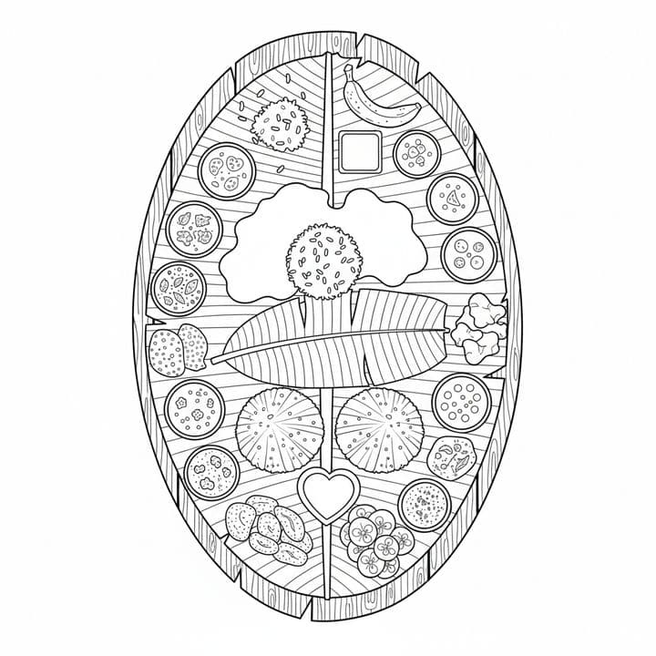 A delightful assortment of Indian cuisine is laid out on an oval wooden tray. The food is arranged artfully, with rice, curries, sweets, and a banana showcased alongside a large banana leaf. The dishe...Read more