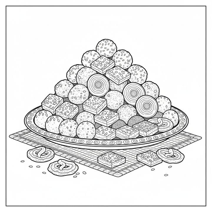 A delightful black and white illustration features a brimming platter of various confections. Round cookies, sliced pinwheel pastries, and square, patterned treats are piled high. Below, a checkered c...Read more