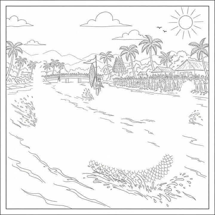 A tropical landscape unfolds along a river. Palm trees line the banks and mountains rise in the distance, near temple architecture. A long line of figures stand watching as a person holding a banner w...Read more