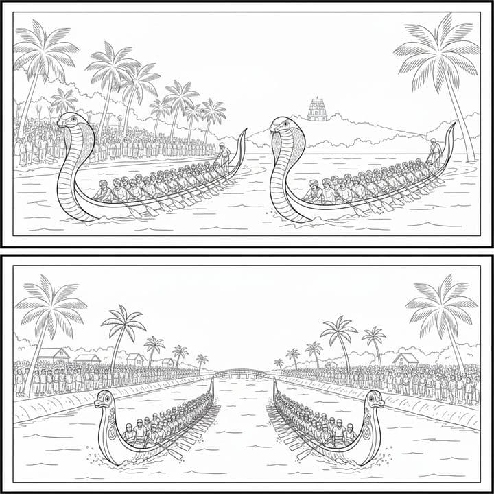 The image depicts two panels of a traditional snake boat race scene. Long, narrow boats with cobra-head prows are rowed by many people. Crowds line the riverbanks, watching the race under palm trees. ...Read more