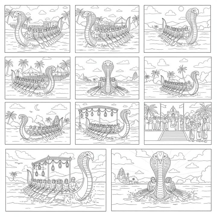 A black and white comic-strip-like illustration shows multiple scenes of traditional snake boats with rowers in a body of water. The boats are adorned with cobra heads at the front. Different scenes f...Read more