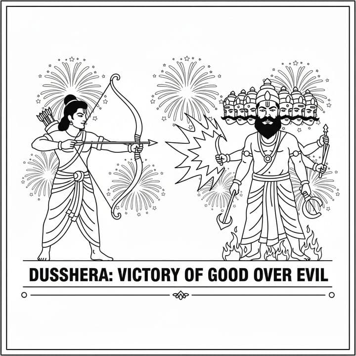 A stylized depiction shows Rama poised, arrow drawn, facing Ravana. Ravana stands amidst flames, multiple arms wielding weapons, and ten heads adorned with crowns. Fireworks fill the sky, hinting at a...Read more