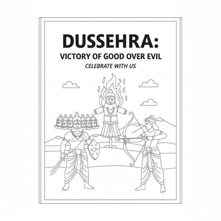 A simple line drawing depicts the Hindu festival of Dussehra. Rama aims his bow at the effigy of Ravana, which is engulfed in flames. Ravana, with his ten heads, stands defiantly, holding a sword and ...Read more