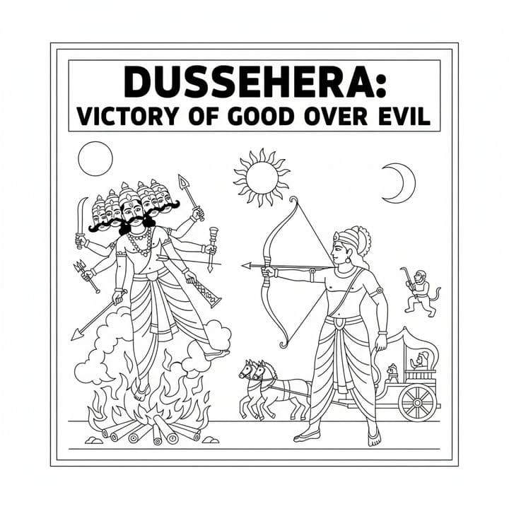 A black and white illustration depicts the Hindu festival of Dussehra. Lord Rama aims an arrow at Ravana, who stands atop a fire with multiple heads and arms. The sky contains a sun, moon, and circle....Read more