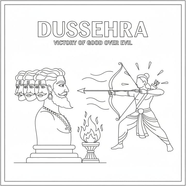 The image showcases the Dussehra festival, symbolizing the victory of good over evil. It depicts Rama aiming an arrow at Ravana, who has multiple heads, against a minimal background. Below them, there...Read more