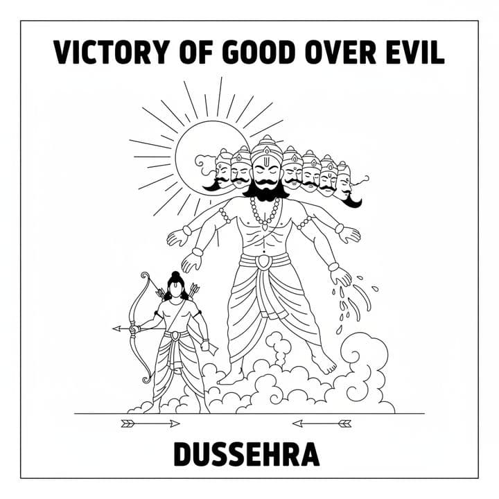 A stylized line drawing celebrates Dussehra, showing the victory of good over evil. Lord Rama stands poised with his bow and arrow, ready to strike down the ten-headed demon king Ravana, who looms lar...Read more