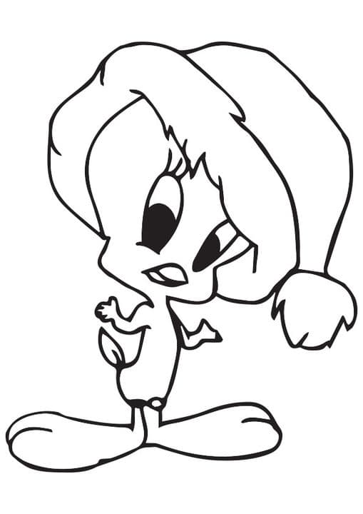 This image is a black and white line drawing of a cute cartoon bird wearing a large Santa hat. The bird has big expressive eyes and a small beak, giving it a charming and festive look. Its wings are s...Read more