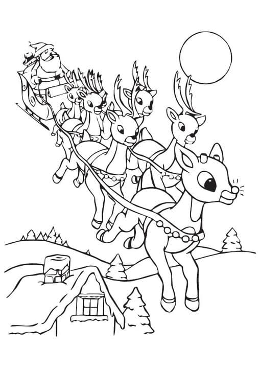 This black and white coloring image showcases a festive scene featuring Santa Claus riding his sleigh, pulled by eight reindeer. The reindeer are depicted in motion, flying through a night sky with a ...Read more