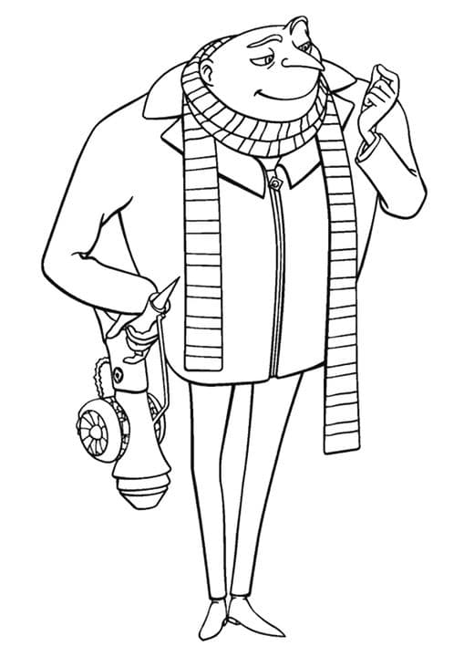 This black and white line drawing features a confident character from an animated movie. He is wearing a jacket and a long scarf, and he has a sly smile on his face. The character is holding a futuris...Read more